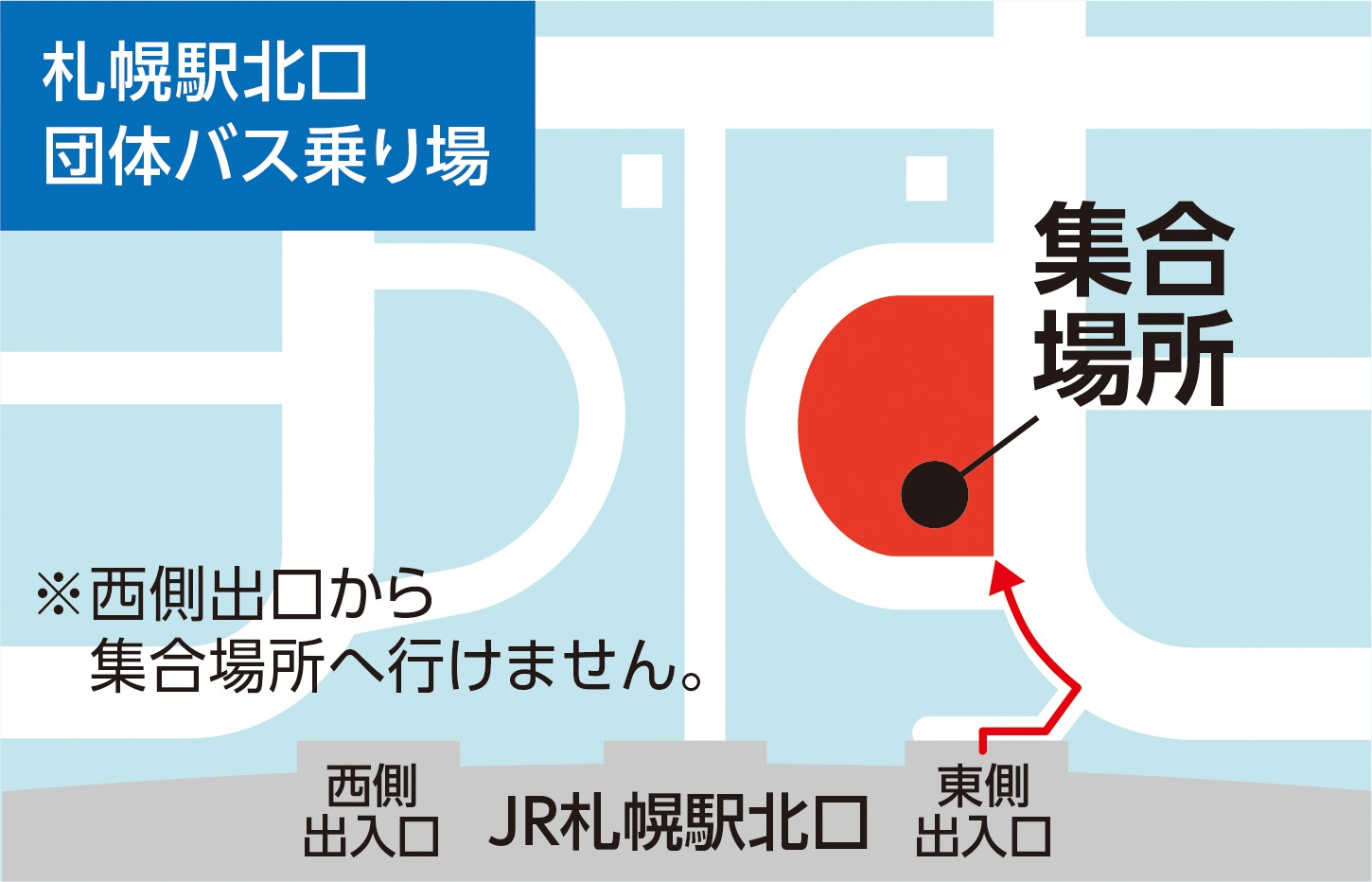 ご出発日当日はJR札幌駅北口にて係員が受付し、お迎えバスまでご案内いたしますので